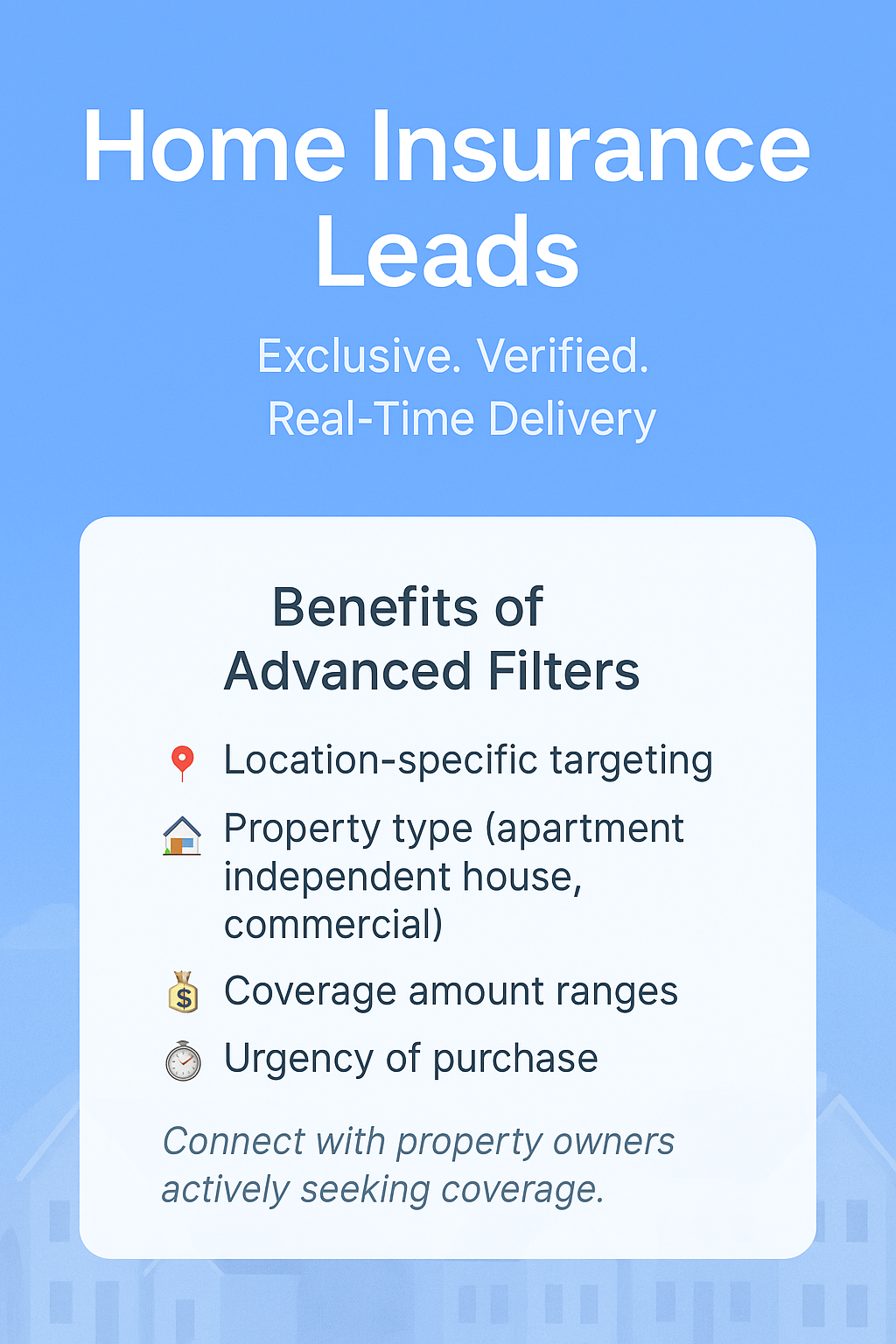 Connect with property owners actively looking for home insurance coverage. Get exclusive, high-intent leads delivered in real time.